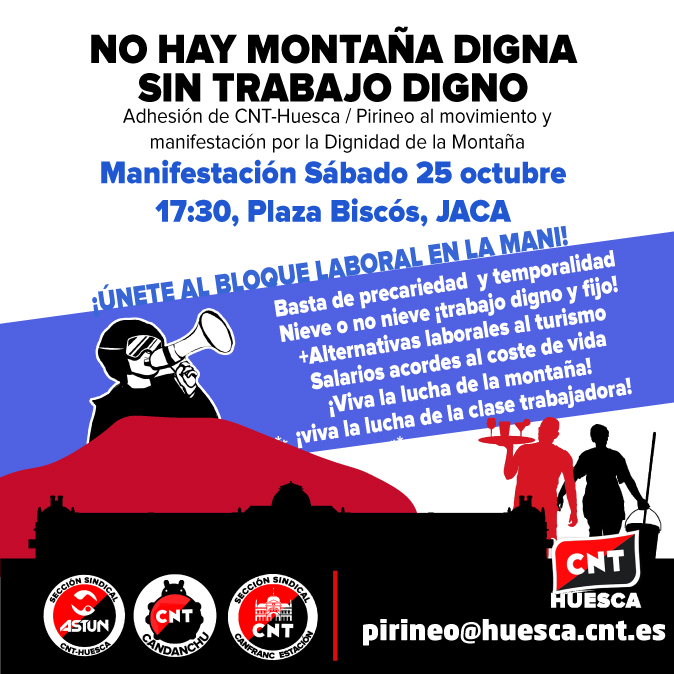 Adhesión de CNT Huesca al movimiento y manifestación por la Dignidad de la Montaña (25 Octubre) “Ni el rey comería si el labrador no labrase” (Lope de Vega) El turismo es el rey de estos valles. Decenas de millones de dinero público van todos los años a los bolsillos de las grandes empresas y proyectos...