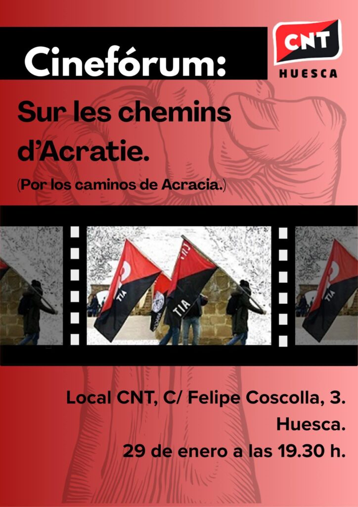 📆Jueves 29 de enero🕜📍19:30 / Local CNT Huesca (C/ Felipe Coscolla 3) Duración de la pelicula: 1h 19min Sinopsis:«los libertarios españoles de 1936 crearon el movimiento revolucionario más profundo e igualitario jamás emprendido a tal escala. En este documental, exploramos el funcionamiento de la colectivización libertaria a nivel nacional, junto...