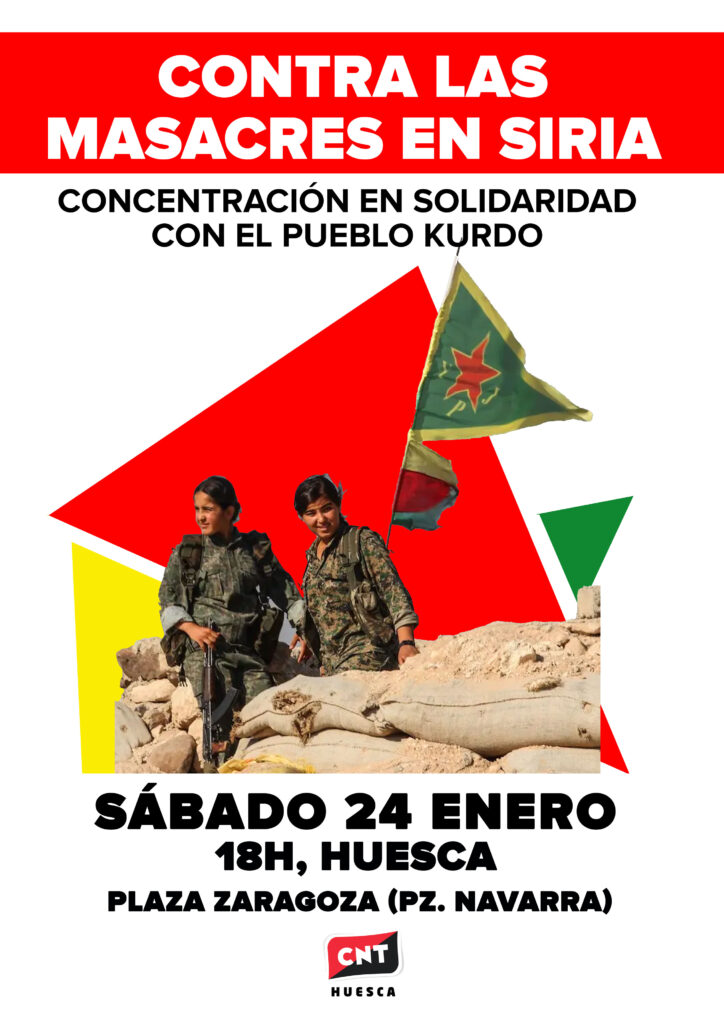 📹Este sábado 24 de enero de 2026 nos concentramos en Huesca en apoyo al pueblo kurdo y contra las masacres en Siria. Rojava (Kurdistán sirio) está bajo grave amenaza gracias a la hipocresía occidental. Occidente está apoyando al nuevo gobierno sirio, quien está aniquilando a drusos, alauitas y kurdos. Compañeros...