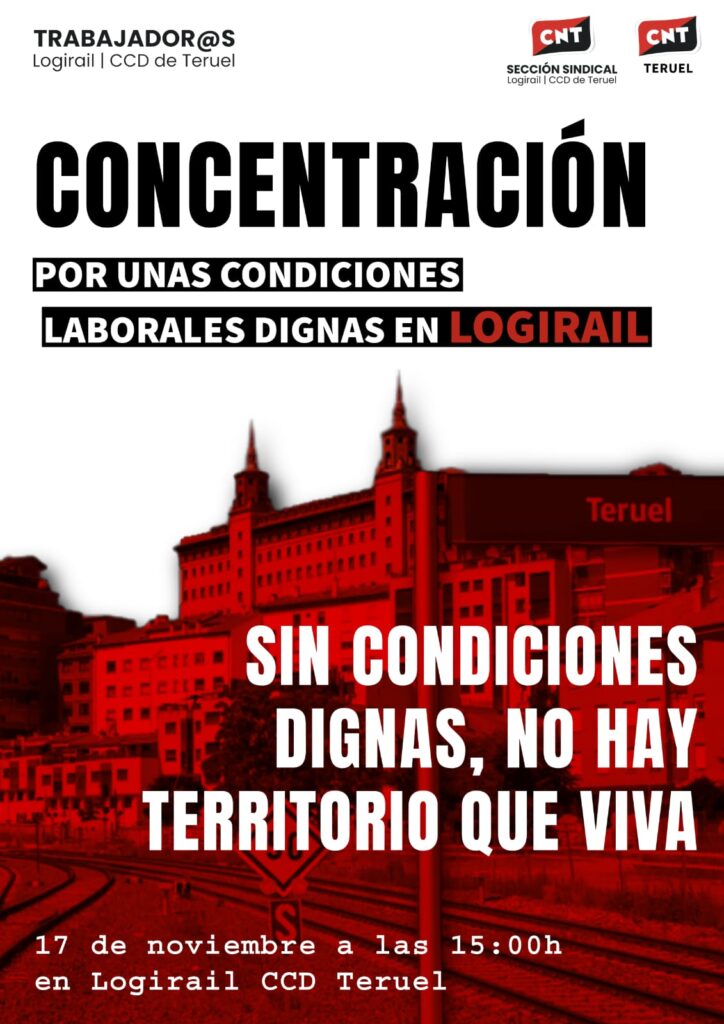 El próximo lunes 17 de noviembre, a las 15:00 horas, la Sección Sindical de CNT en Logirail Teruel impulsamos, tras haber sido aprobado en asamblea de trabajadoras y trabajadores del centro, una concentración frente al Centro de Competencias Digitales (CCD) de la empresa, en la Plaza de la Cultura, 5...