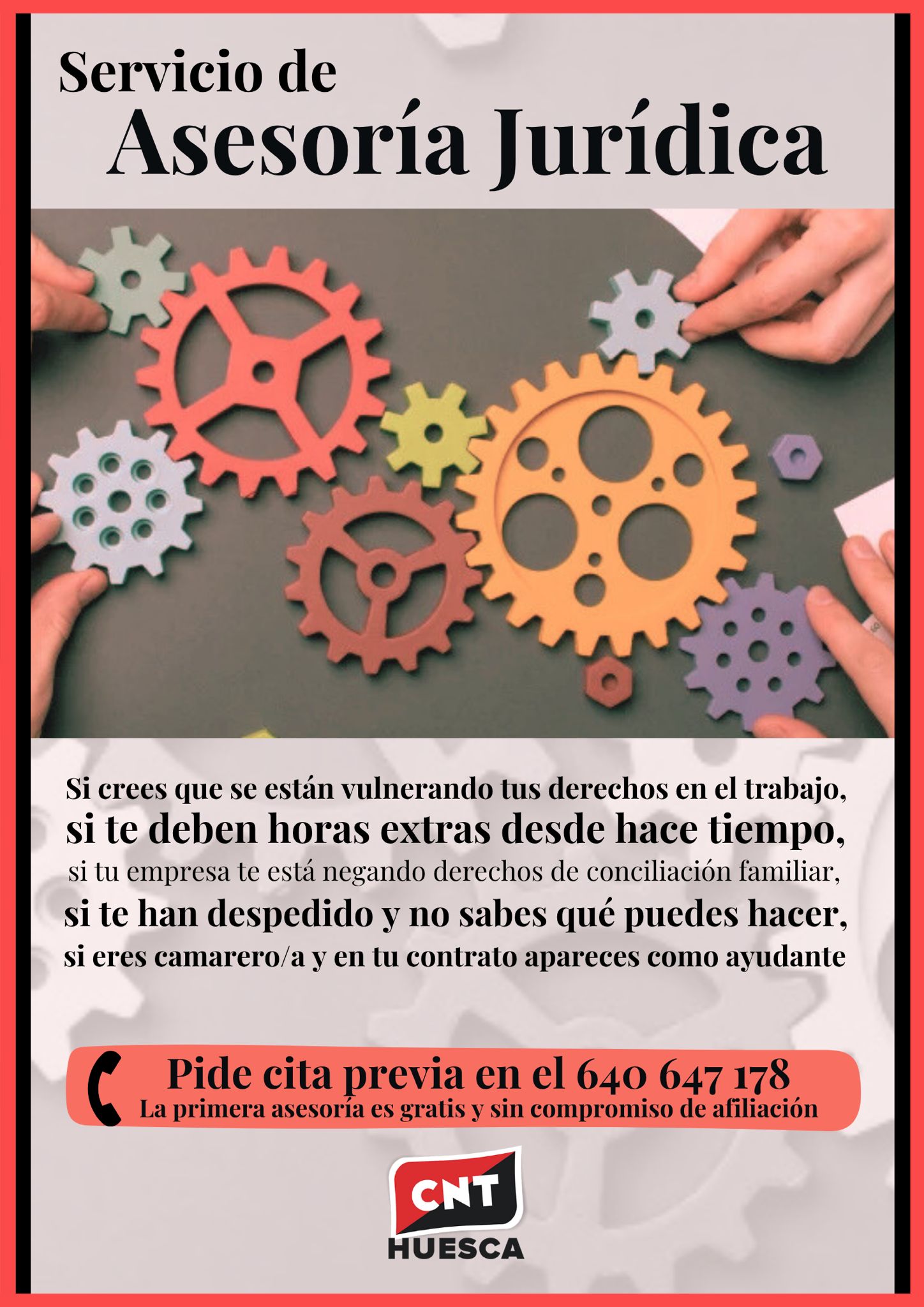 Desde CNT Huesca os informamos de que está activo el servicio de asesorías jurídico-laborales del sindicato, que son gratuitas para toda la afiliación